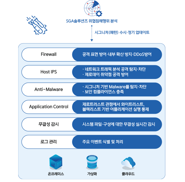 vAegis는 기존의 온프레미스 환경, 가상화 환경, 하이브리드 환경 등 모든 IT 환경 서버 워크로드를 수용하며 클라우드 서비스에 영향을 주지 않는 최적의 설계로 강력한 보안 성능 제공합니다. Host IPS, Firewall, Anti-malware, 어플리케이션 실행 통제, 무결성 감시 등의 다양한 보안 기능을 제공합니다.